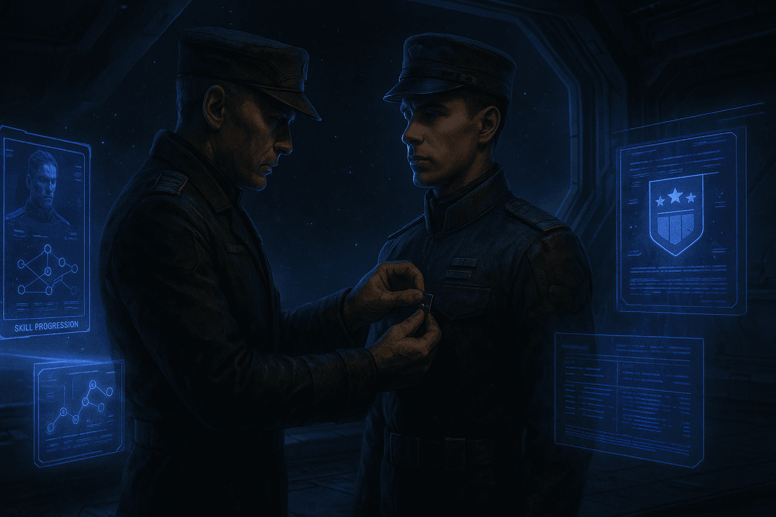 Officers don't stay static. Every officer gains XP from relevant in-game actions and levels up from 1 to 10, unlocking a random trait at levels 2, 4, 6, and 8. Over a season a well-used officer accumulates a unique combination of up to four traits - compounding into a noticeably different tool from any other commander of the same type.
